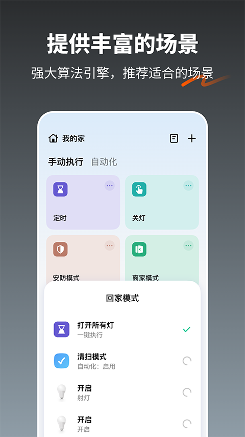 可根据时间、天气、设备状态等条件设置触发规则,自动执行预设任务,让家中设备按需自主运转,省心更高效。