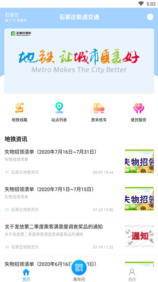 石家庄轨道交通app是由石家庄市轨道交通有限责任公司推出的一款地铁出行服务软件,软件界面直观,功能丰富,提供了扫码乘车、行程查询、交易查询、地铁资讯、线路图、站点信息、列车时刻以及失物招领等便民服务。同时通过这款软件用户们可以轻松实现手机端乘车购票,只需要手机上绑定乘客本人的银行储蓄卡或信用卡,进出地铁站就可直接扫码通过了。除此之外,使用石家庄轨道交通app用户可以通过线路图,然后了解地铁线路的走向,站点信息让乘客可以找到距离目的地最近的出站口,列车时刻表,也可以让每位乘客掌握列车的收发时间,提前安排出行计划。