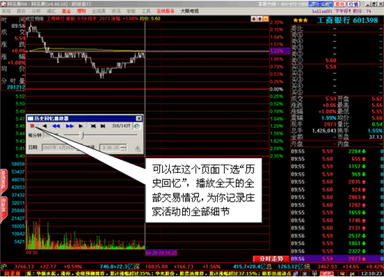 您还可以将此功能与“智能”菜单里面的“历史回忆”功能结合起来使用,通过选择日期来为您全面重现历史上任意一天的盘中走势。