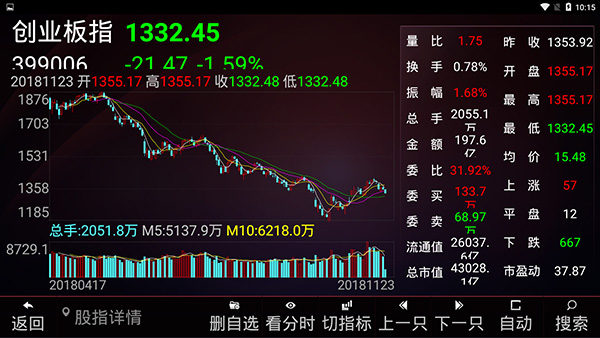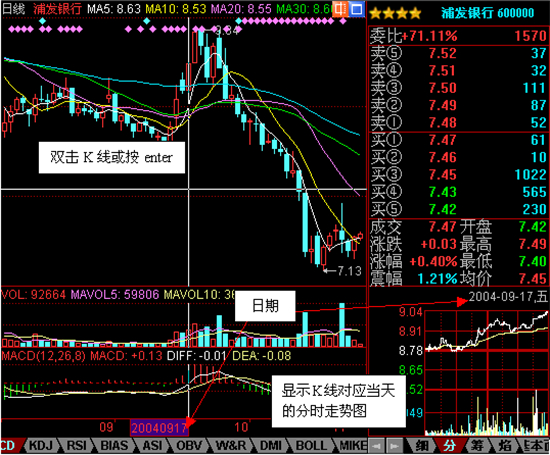 可以方便地查看历史上的分时走势,只要在K线图上的某根K线上双击鼠标或者将光标移到某根K线上右下角的分时走势窗口就会显示相应的那一天的分时走势。