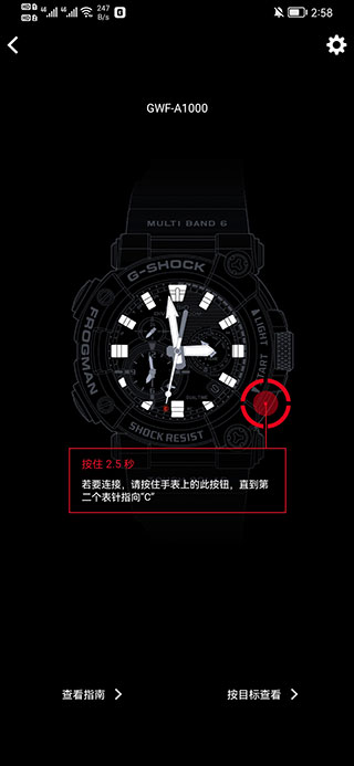 1、卡西欧手表想要连接手机上的蓝牙,需要下载G-SHOCK Connected应用程序,之后打开手机的蓝牙功能,将手机和手表靠近,点击SHEEN或者EDIFICE,配对成功之后手表的秒针会向6点的C字母靠近。