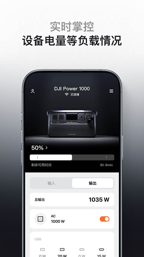 DJI Home可与设备连接并进行管理和智能控制,支持DJI Power Expansion Battery 2000、DJI Power 1000,以DJI Power系列为例,通过蓝牙将设备与DJI Home连接后,你可通过app实时方便的查看电量,以及对电池充电放电程度进行设置。