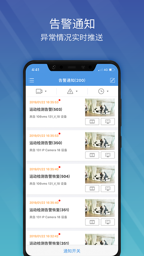 5、当触发告警时,移动终端接收到告警提醒,用户可以及时查看直播,告警视频,捕获等,并处理告警情况。