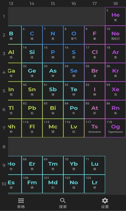 ●完整周期表:软件主页以炫酷简约的界面展示了完整的元素周期表,