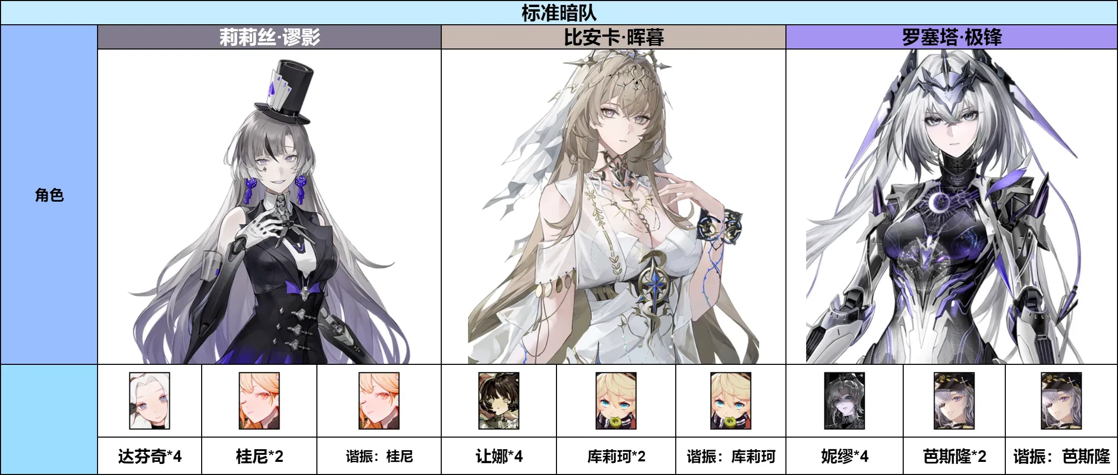 标准的暗队组成,如果是3S及以上的队伍,谬影可以换成6达芬奇2桂尼.囚笼里极锋单C时,除了要搭配谬影外,对第三人并没有硬性要求.可以晖暮带辅助意识,或者有共鸣的其他装甲型.