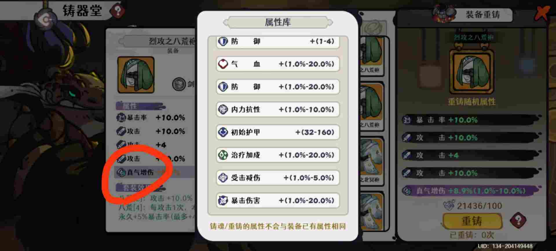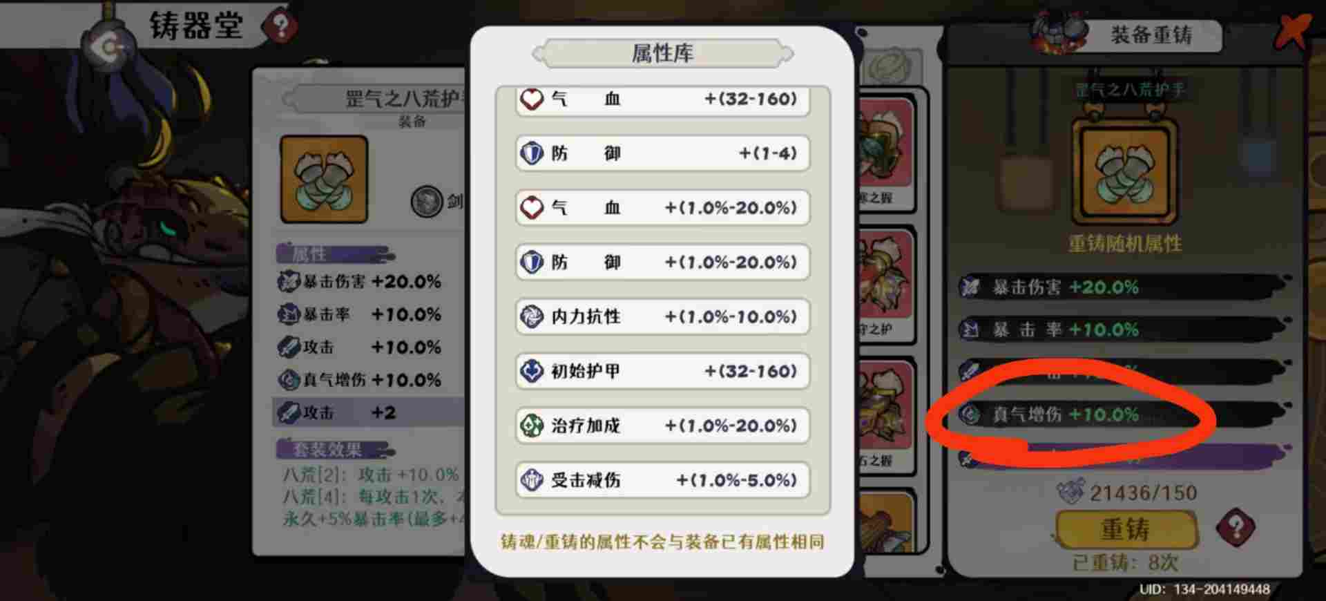 由于铸魂时注意无法铸魂出已有属性,且衣服和手没有外功增伤,有真气增伤,其他三个没有真气增伤,有内、外攻增伤,由于八荒手和散件的衣服、手都带双爆,故这几件的双爆装备最好是穿云或者破山、惊雷的前缀,铸魂出真气增伤