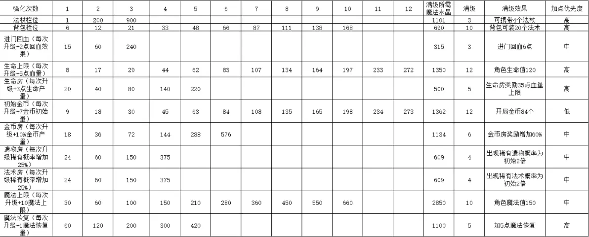 游戏共11个天赋,初始有3个天赋可加强。其余8个天赋需要消耗古神之血才能解锁,每次解锁2个新天赋,全部天赋解锁共需要125点古神之血。天赋加点需要使用魔法水晶,加点项可以重置不消耗魔法水晶,过不了关卡时可以重置天赋加点选项再挑战,全部满级需要11620魔法水晶。