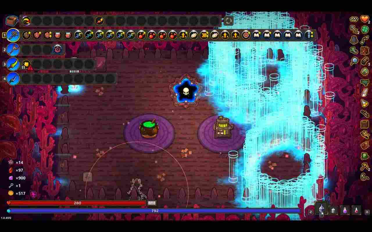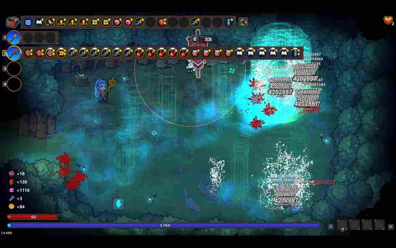 这套光柱追踪玩法,在前期可以用其他召唤物,比如这局我用的二重奏克总过渡的,等魔法书、魔方数量起来,还有光柱等级起来就可以使用光柱。(这里说一下一星光柱是没有碰撞伤害的)光柱可以抵挡弹幕也是手残不会躲弹幕党的福音。