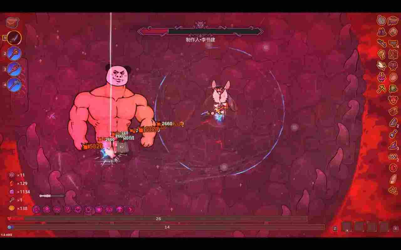 最后分享几张实战的图,玩的有点糙,为了搞诅咒成就拿了一堆诅咒,最后15个诅咒拿到了,还移除了好几个,后面来诅咒遗物了就没移后面的,玩的有点难受,法杖后面也忘换了,导致最后差一点打过熊猫人。